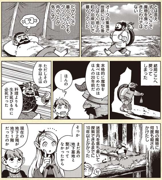 1話で軽率に大サソリを調理するライオス一行を見かねて、料理番として同行することになったドワーフです。食事や魔物食への執着は、かつて迷宮で遭難し、飢えに苦しんだこと、そしてその際に体験した出来事が影響しています。