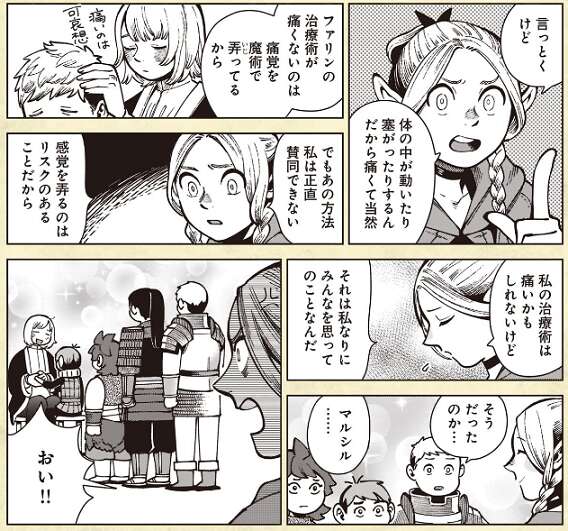 マルシルの治療術は評判が悪く、ファリンの治療術の方が断然評判が良いです。マルシルは自分なりの思いがあって痛覚を魔術でいじってないと訴えますが、やはり仲間はファリンの治療を望みます。