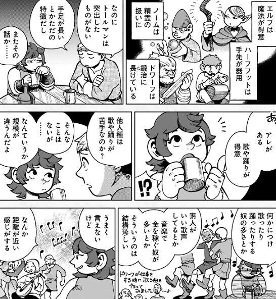 ライオスは、エルフは魔法が得意、ハーフフットは手先が器用、ノームは政令の扱いに長ける、ドワーフは鍛冶に長ける、のような突出したものがない、と以前から悩んでいます。ナマリから、歌や踊りが得意、歌ったり踊ったりする人の多さ、が他の人種では珍しいと慰められます。