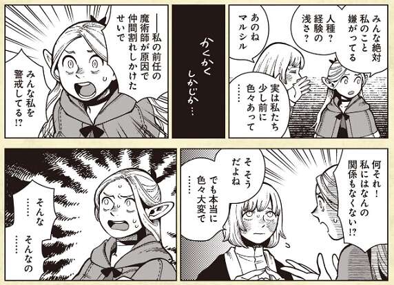 描き下ろし漫画では、ライオス一行に加わった直後の話です。多くの人物から避けられている事をマルシルは気にしますが、それは前任の魔術師が原因でした。