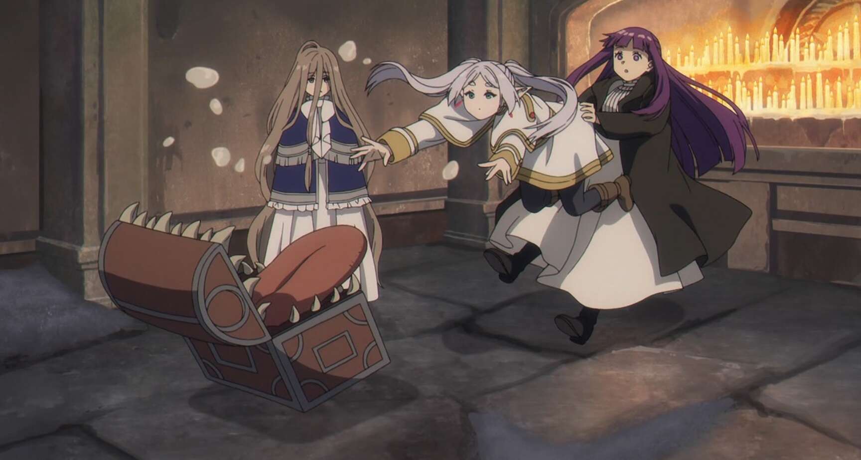 フリーレンは宝箱を見付けて、この魔力…魔導書かも、と宝箱を開けようとします。しかしフェルンから、宝箱を判別する魔法(ミークハイト)の結果はミミックだと言って宝箱を開けないように注意されます。しかし、ミークハイトの魔法の精度は99%だとフリーレンは言い、残りの1%を見破った偉大な魔法使い達がいたからこそ、歴史的な発見があったんだ、と言うと、フリーレンは迷わず宝箱を開けます。