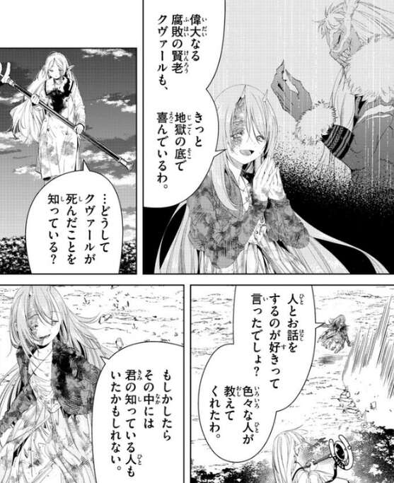 そして、人を殺す魔法(ゾルトラーク)がここまで人類の魔法の主流となれば、偉大なる腐敗の賢老 クヴァールも、きっと地獄の底で喜んでいるわ、とソリテールはフリーレンに言います。フリーレンは、クヴァールが死んでいる事をソリテールが既に知っている事に驚きますが、ソリテールは色々な人から教えてもらった、と言います。そして、その中にはフリーレンが知っている人もいたかもしれない、とソリテールはフリーレンを挑発します。フリーレンは、言葉を使って動揺を誘う典型的な魔族の手法と分かっていましたが、それでも怒りを覚えてしまいます。そして、ソリテールの言葉を使って動揺を誘う手法が手馴れていることに気付き、その“学習”のためにどれだけの人々を殺してきたのか、とフリーレンはさらに怒りを覚えます。
