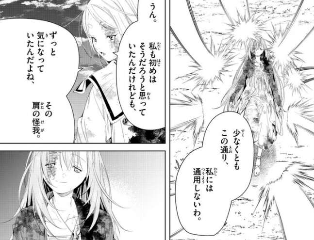 ソリテールは、人類の魔法体系に取り込まれた人を殺す魔法(ゾルトラーク)に対しては無知だけれども、解析にはそう時間は掛からないし、対処ならばもっと早い、と言うと、フリーレンの人を殺す魔法(ゾルトラーク)を防いで見せます。そしてソリテールは、私には通用しないわ、とフリーレンに言います。しかし、フリーレンは驚かずに、その肩の怪我がずっと気になっていたんだよね、とソリテールに話します。