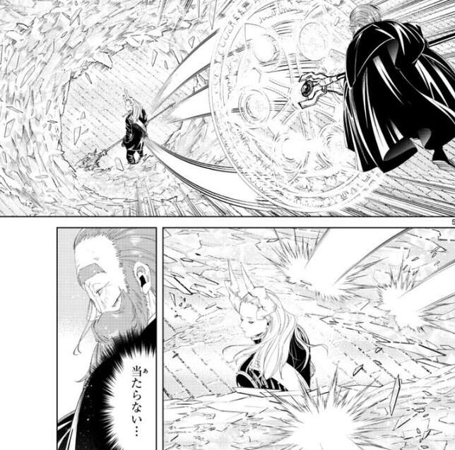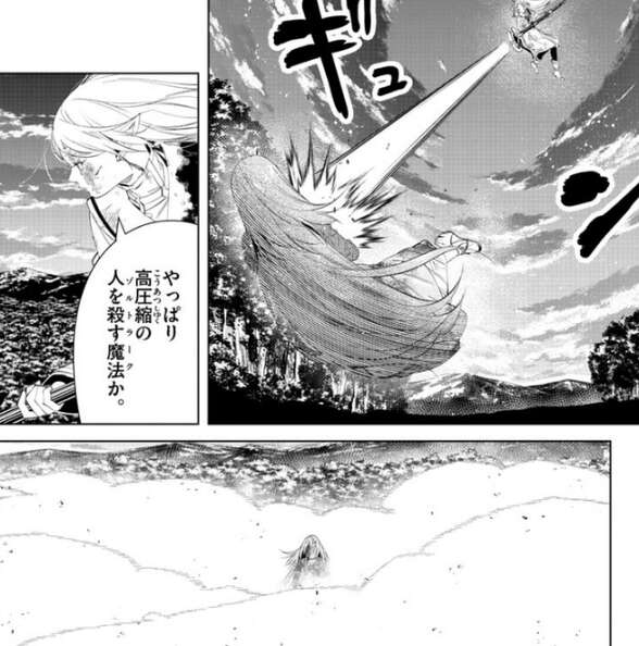 そして、フリーレンは高圧縮の人を殺す魔法(ゾルトラーク)をソリテールに撃つと、ソリテールに直撃したように見えましたが、直前でソリテールに防がれてしまいます。