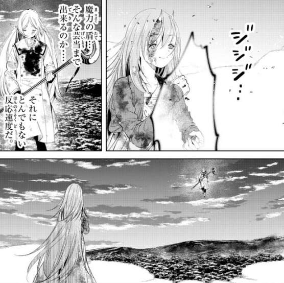 ソリテールは魔力の盾を瞬時に作り出して、フリーレンの人を殺す魔法(ゾルトラーク)を防いだようです。しかしフリーレンは攻撃を防いだという事は、高圧縮の人を殺す魔法(ゾルトラーク)自体は有効打になり得る、と分析します。しかし、ソリテールは瞬時に魔力の盾を作り出すことが出来るので、隙を突く必要がありさらに速度も必要となります。
