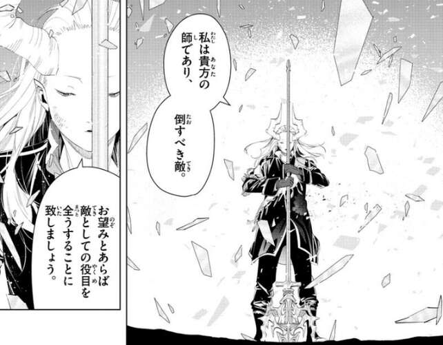 マハトは武器を構えて力を込めると、お望みとあらば敵としての役目を全うすることに致しましょう、とデンケンに言います。