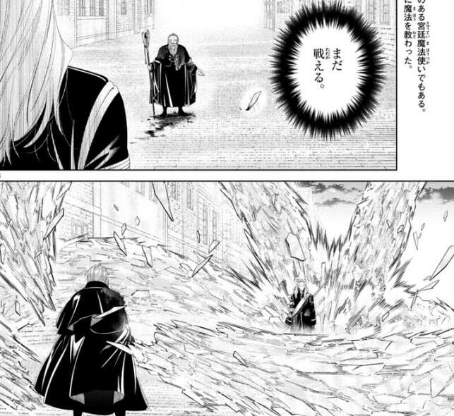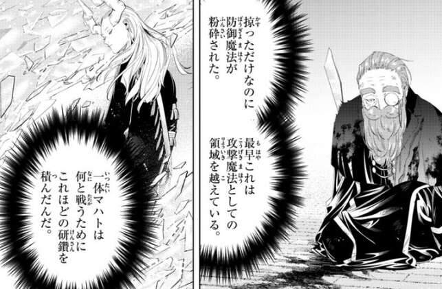 その内、デンケンは無数の金片による攻撃を避け切れなくなり、掠ってしまいますが何とか防御魔法で防御します。しかし、無数の金片はデンケンの防御魔法を粉砕し、デンケンに重傷を負わせます。人の身では決して辿り着けない魔法の高みにいるマハトに、デンケンは改めて驚愕します。