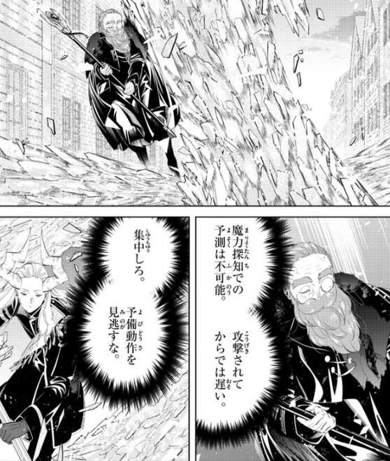 マハトの無数の金片による大質量攻撃は、魔力探知では予測は不可能で、デンケンはマハトの予備動作を集中して中止することで、無数の金片による大質量攻撃を予測しようとします。
