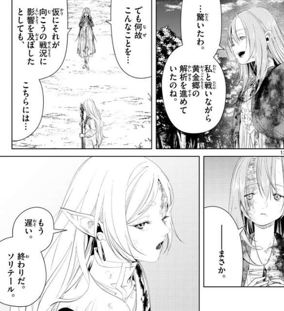 一方、黄金郷が元通りになっても自分との戦いには影響はないはずと思っているソリテールは、フリーレンに、こちらには…、と言いかけてフリーレンの狙いに気付きます。しかし、フェルンは既に黄金から元に戻っていて、潜伏しつつソリテールを狙っていました。