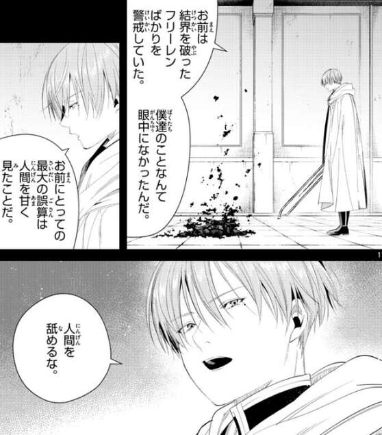 ヒンメルは、お前にとっての最大の誤算は人間を甘く見たことだ、とヒンメルは言うと、人間を舐めるな、と消えてゆく不死なるベーゼに対してつぶやきます。