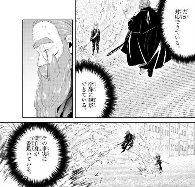 マハトの無数の金片による大質量の攻撃は、さらに激しくなっていきますが、それでもデンケンは冷静に観察し対応できています。デンケンの若い頃の記憶では、マハトは決して超えられぬ師のままだったので、マハトに対応できている事実にデンケン自身が一番驚いていました。