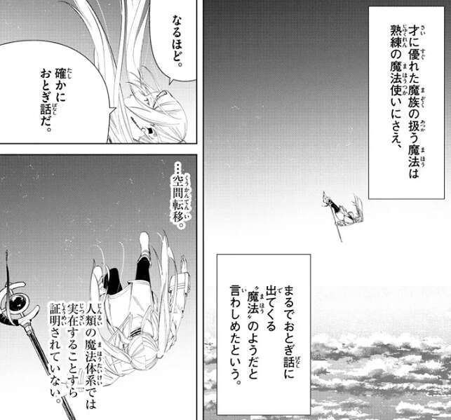 魔族と人類の魔法体系には天と地ほどの差があり、才に優れた魔族の扱う魔法は熟練の魔法使いにさえ、まるでおとぎ話に出てくる“魔法”のようだと言わしたようですが、人類の魔法体系には実在する事すら証明されていない、空間転移の魔法でフリーレンを空に飛ばしたようです。この時代、人類は飛行魔法を持っていないので、この時代の魔法使いなら、このまま自由落下で簡単に死んでしまいます。