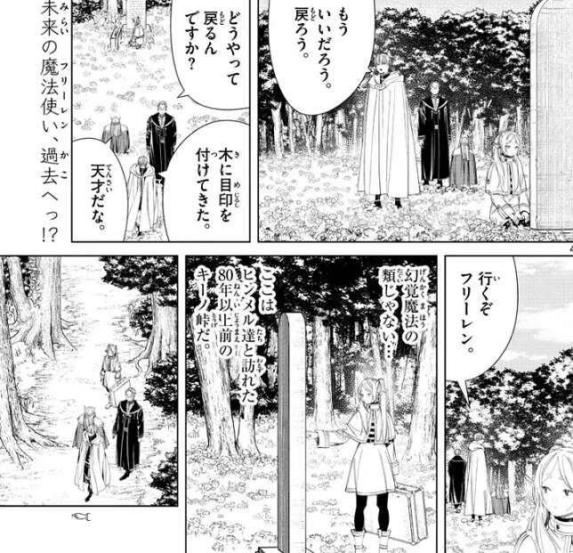 勇者ヒンメルの死の53年前、勇者一行の旅立ちから7年後の北部高原、キーノ峠にいる事をフリーレンは確認、さらにこれが幻影魔法の類じゃない、と冷静に分析します。ヒンメルはフリーレンに女神の石碑の解析を止めて、街道に戻ろうと呼びかけます。