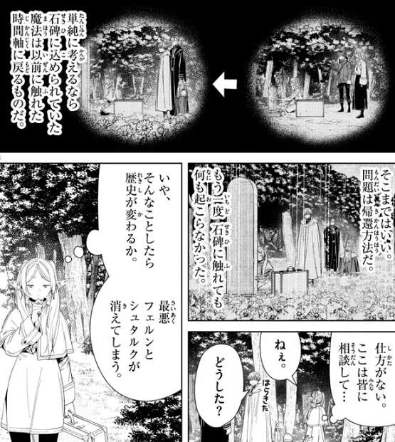 時間を逆行した可能性について考えるフリーレンですが、不可逆性の原理を完全にぶち壊していると信じることが出来ません。しかし、女神さまの魔法はほとんど解明されていないし…、とフリーレン考え、とりあえず石碑に込められた魔法によって以前に触れた時間軸に戻った、とフリーレンは仮定して考えることにします。問題は帰還方法で、フリーレンはもう一度石碑に触れてみたようですが、何も起こりませんでした。仕方なくフリーレンはヒンメル達に相談しようとしますが、歴史が変わって最悪フェルンやシュタルクが消えてしまう可能性気付き、途中で相談を止めます。