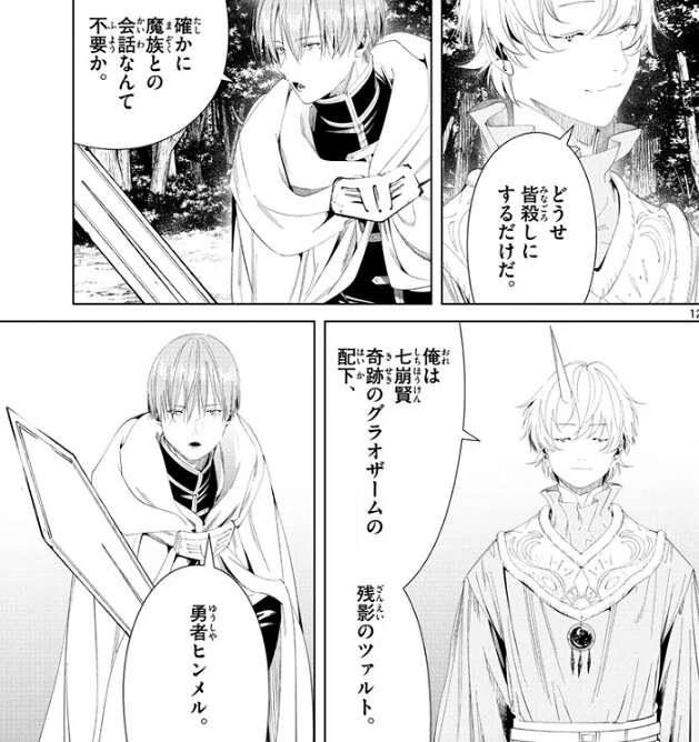 ヒンメルが、何の話だ?と、言いますが、魔族は会話する気が無いようで、どうせ皆殺しにするだけだ、と言います。七崩賢 奇跡のグラオザームの配下、残影のツォルト、と魔族は名乗り、ヒンメルも自分の名を名乗ります。