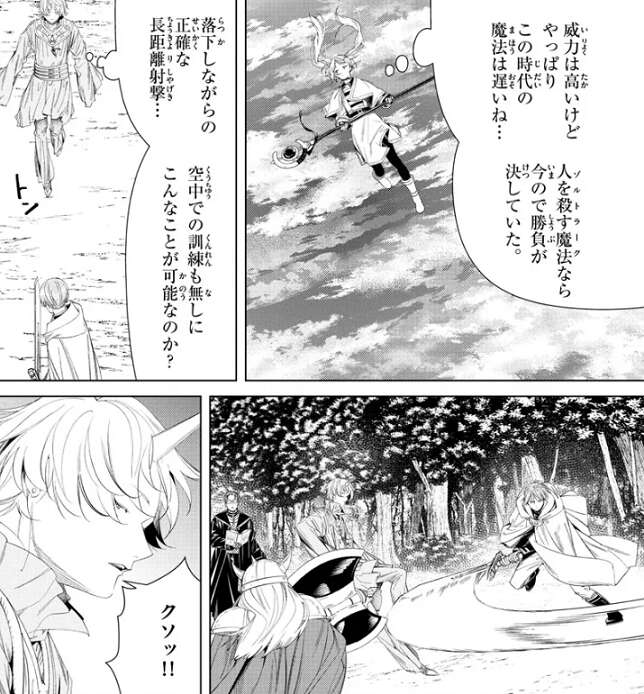 この時代の魔法は未来の魔法に比べて遅いようで、人を殺す魔法(ゾルトラーク)なら今ので勝負が決していた、とフリーレンは残念がります。一方、ツォルトはフリーレンが落下しながら正確な長距離射撃をしたことに、空中での訓練も無しにこんなことが可能なのか?と、驚きます。