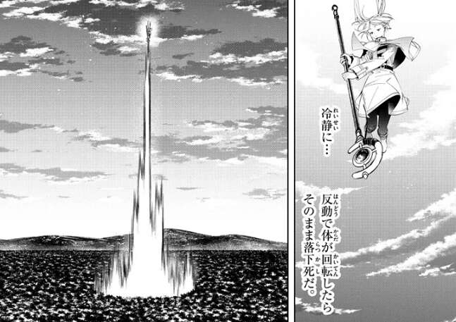 空から自由落下中のフリーレンは、そろそろ落下速度を相殺しないと、と思い、地上に向けて魔法を撃ちます。上手く落下速度を相殺で来たようで、フリーレンはそのまま無事、地上に着地します。フリーレンが地上に着地したのを見て、なんて精密な魔力のコントロールだ…、とツォルトは内心驚きます。