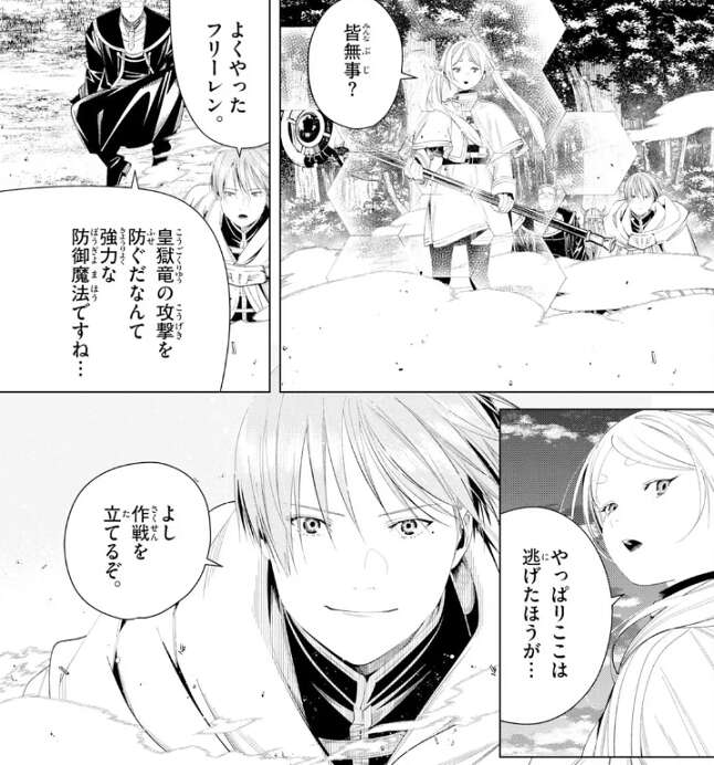 フリーレンが防御魔法で皇獄竜の攻撃を防ぎますが、フリーレンは逃げた方がいいとヒンメルにアドバイスします。しかし、ヒンメルは逃げることなくすぐに作戦を立てて、アイゼンには前方で敵を引き付けるように言い、ハイターには後方支援を指示します。