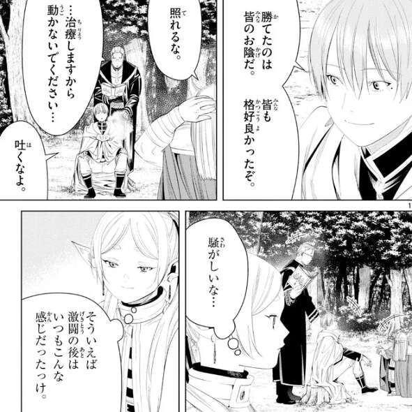 ヒンメルは、見たか僕の最後の一撃、格好良かっただろう、と自慢しますが、一歩間違えれば俺達は消し炭になっていたがな、とアイゼンは答えます。勝てたのは皆のお陰だ、とヒンメルは言い、ハイターの治療を受けます。そんな風景を見ながらフリーレンは、騒がしいと思いつつ、激闘の後はいつもこんな感じだったとヒンメル一行のやり取りを懐かしく思います。