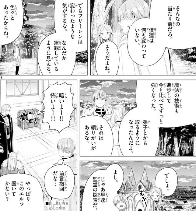 ヒンメル達は変わらないとフリーレンが言うと、そんなの当たり前だろ、とヒンメルは答えます。そして、フリーレンは変わったような気がする、なんだか達観しているように見えるとヒンメルが言うと、色々あったからね、とフリーレンは言い、魔法の技術も進歩して今よりずっと強くなったし、弟子とかも取るようになったとフリーレンは答えます。頼りがいがあるな、とヒンメルが言うと、フリーレンは自信満々に、でしょ、と答えます。その後、早速聖堂の探索をしますが、フリーレンはいきなりミミックにくわれてしまいます。暗いよー!!怖いよー!!と、叫ぶフリーレンに、ヒンメルは呆れたように、全言撤回だな、とつぶやきます。