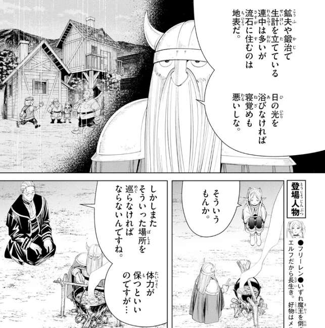 北部高原の集落は魔物の脅威から自衛するために、複雑で入り組んだ地形にあることが多く、集落に辿り着くだけ体力がいることが多いようです。今まで立ち寄った集落も、崖の上に遭ったり、峡谷の底に遭ったり、大きな湖の孤島に集落があったりと大変だったようです。洞窟の中に集落があったこともあるようですが、ドワーフなら洞窟の中に集落があっても普通なんじゃないの?と、フリーレンはアイゼンに尋ねます。