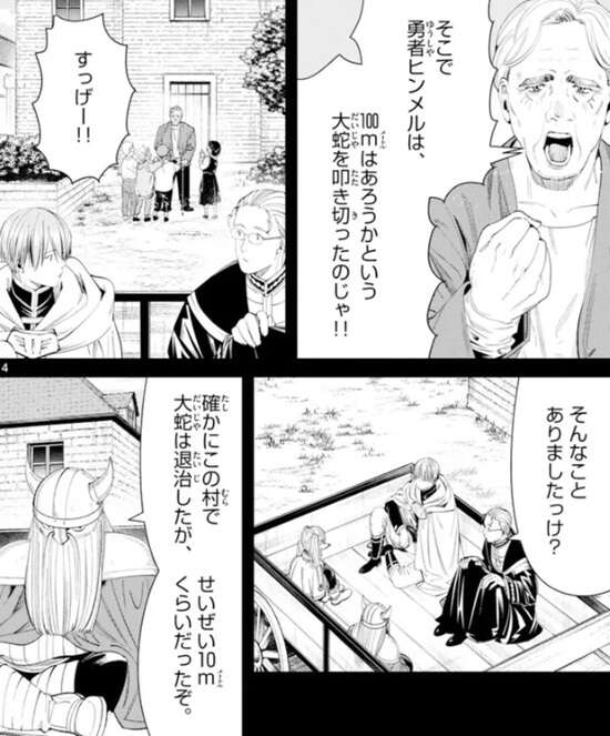 フリーレンの回想となり、ヒンメル一行が馬車で移動しています。どうやら魔王を倒した帰り道のようですが、勇者ヒンメルの噂話が聞こえてきます。勇者ヒンメルが100メートルはあろうかという大蛇を叩き切った、という話を村人が子供達にしていて、子供達もその話を信じています。アイゼンの話を聞くと、この村で大蛇を退治したの事実のようですが、実際はせいぜい10メートルの大きさだったようです。
