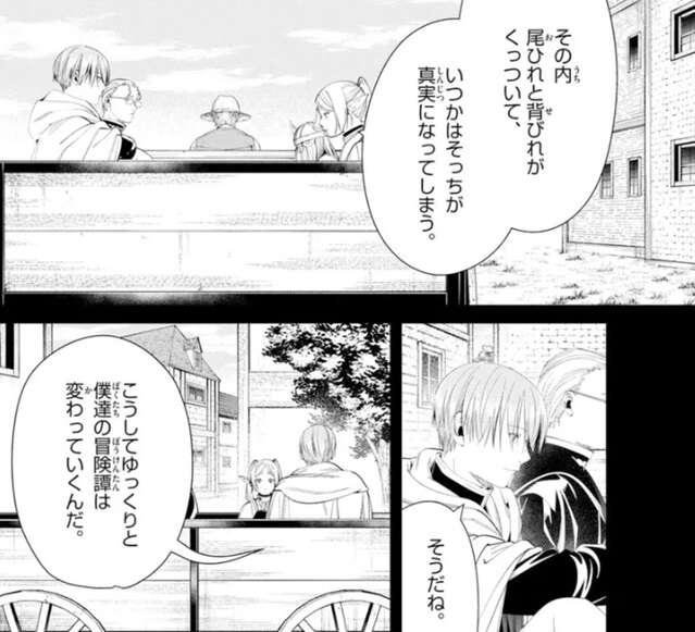 まだ魔王を倒した帰り道なのにこんな噂が広がっているんだ、その内尾ひれと背びれくっついて、いつかそっちが真実になってしまう、とフリーレンは危惧します。しかし、こうしてゆっくりと僕達の英雄譚が変わっていくのは少し残念だけど、伝聞や継承が変わっても成してきたことは変わらない、とヒンメルは言います。