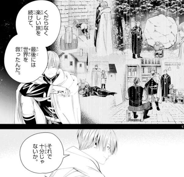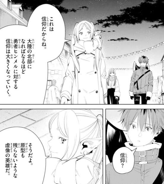 大陸の北部になればなるほど、勇者ヒンメルに対する信仰は大きくなるそうで、原型も残らないような虚像の英雄となってしまう、とフリーレンは言います。シュタルクは釈然としませんが、フリーレンは、でもそれでいいんだよ、ここに悪い人は誰もいないんだ、と答えます。