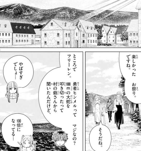 ヒンメルとの思い出を振り返り、フリーレンは勇者ヒンメルの像を触りつつ、祭りを楽しむ村人達を見ます。虚像の英雄となって原型が無くなっても、この人達はヒンメルが救った世界を称えている、ヒンメルが言う通りそれで十分だと、フリーレンは考えます。翌日、祭りを楽しんだフリーレン一行はボーネ村を旅立ちますが、勇者ヒンメルが1,000メートルの大蛇を叩き切ったという話を村の爺さんから聞き、半信半疑のシュタルクがマジなのかフリーレンに質問しています。さすがに100倍に誇張されて、フリーレンもあきれています。