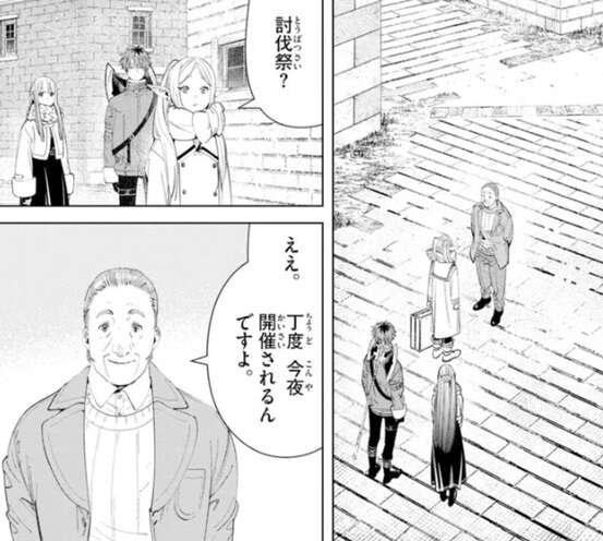 勇者ヒンメルの死から31年後、帝国領ボーネ村に到着したフリーレン一行は、村長から討伐祭が今夜開催されることを教えてもらいます。この村に来たのも何かの縁だから、ぜひ参加してください、と村長から誘われます。