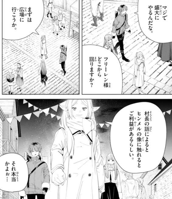 討伐祭は魔王が討伐された日に行われる帝国のお祭りで、盛大に祝うのでおいしい物が食べられるそうです。おいしい物が食べられると聞き、フェルンもシュタルクも食事に期待します。そして討伐祭が始まり、フリーレンはまずは広場へと行こうとします。広場にはヒンメルの像があり、村長によるとヒンメルの像に触れるとご利益があるそうです。
