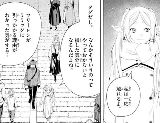シュタルクはご利益があると聞いても信じていませんが、フリーレンは一応触ると言います。タダだし、なんかそういうのってやっておかないと損した気分になるんだよね、とフリーレンは言いますが、シュタルクはフリーレンの言葉を聞いて、フリーレンがミミックに引っかかる理由が分かる気がする…、とツッコみます。