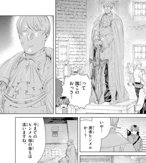 すると先ほどの村長が現れて、素晴らしい像でしょう、と言い、勇者ヒンメル様の像がだいぶ古くなっていたから、村人達に寄付を募って新しい像を作ったと言います。勇者ヒンメル様も天国で喜んでいることでしょう、と村長は言いますが、シュタルクは一言言いたくなったのか、なぁこの像って…、と言いかけてフリーレンに止められます。フリーレンは、祭りに水を差すようなことじゃない、それに言ったって仕方のないことだ、とシュタルクに言います。