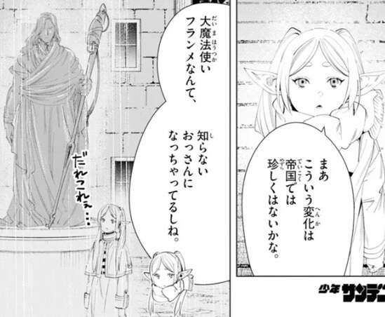 しかし、フリーレンは帝国ではこういう変化は珍しくないと言い、大魔法使いフランメなんて知らないおっさんになっちゃってるしね、とシュタルクに教えます。帝国は昔から英雄を祭り上げて神格化する傾向化が、死んだ人限定ですがあるそうです。