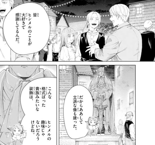 フリーレンは皆がヒンメルのことが大好きで感謝しているからそれで満足なようで、だからああして立派な像も建った、とフリーレンは言います。こんな格式ばった貴族みたいな装飾は、ヒンメルの趣味じゃないだろうけどね、とヒンメルの気持ちを代弁した後、せっかくの祭りなんだから楽しもう、とフリーレン達はおいしい食べ物をたくさん楽しみます。