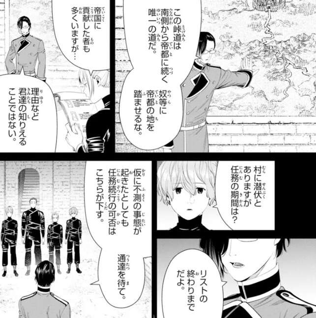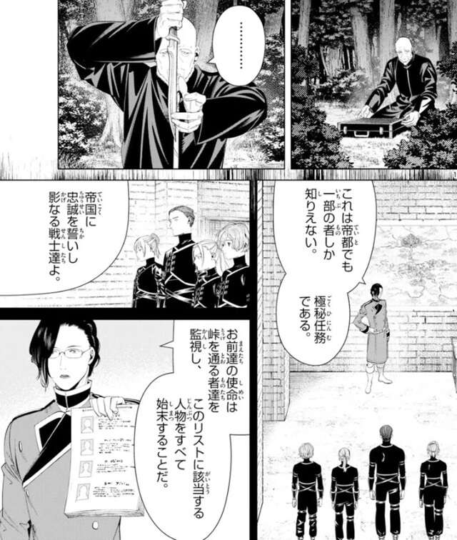 峠道は当時では南側から帝都に続く唯一の道だったようで、リストの人物達に帝都の地を踏ませるな、と男は言います。リストの中には帝国に貢献した者も多いようですが、理由など君達の知りえることではない、となぜ始末するのか理由は教えてもらえません。村に潜伏する任務の期間も、リストの人物を全員始末するまでのようで、仮に不測の事態が起きたとしても任務続行の可否は帝国側が判断するようで、通達を待つように四人の戦士に言います。場面は現在に戻り、リストの人物はフリーレン以外は始末されたようで、リストにはフリーレン以外の人物に×がついています。四人の戦士もラダール以外はもういないようで、ラダールとフリーレンはお互い最後の一人になってしまったようです。ラダールは平穏に余生を過ごしたかったようですが、俺には許されないんだな、とラダールはつぶやきます。