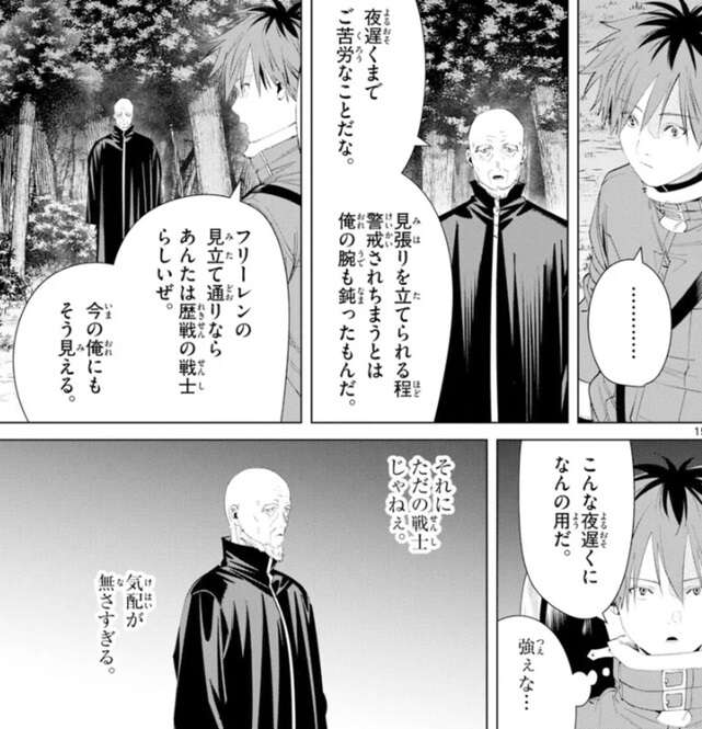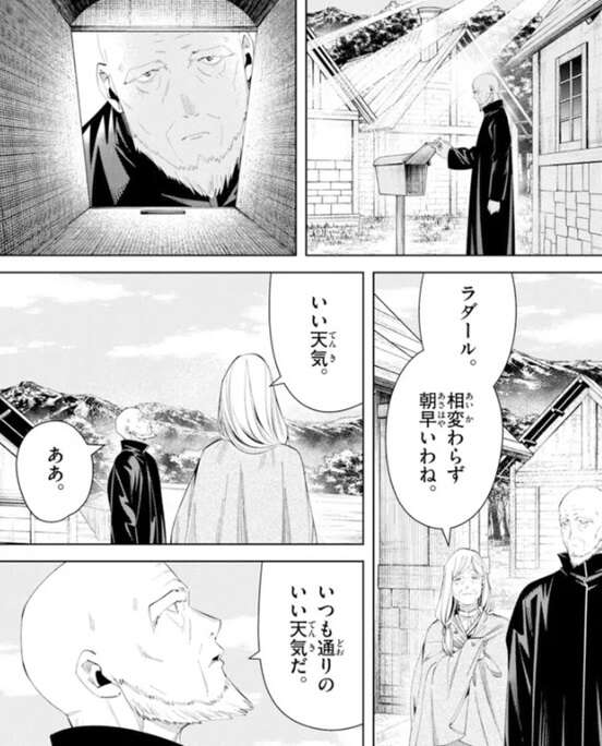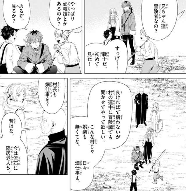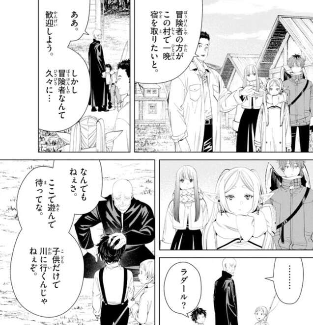 その後、ラダールから少し離れた場所の空き家を紹介されると、フリーレンも普通の振る舞いに戻り、ありがとう、とラダールに感謝します。村の子供に冒険者を始めて見たとシュタルクは言われると、シュタルクは子供の相手を始めます。ラダールから、村の連中に冒険譚でも聞かせてやって欲しい、こんな村じゃ、娯楽もなくてな、日々畑仕事よ、と言われ、フリーレンはラダールに、村長も畑仕事を?と、聞きます。ラダールは、昔はな、今は流石に隠居老人さ、とフリーレンに答えた後、フリーレン達は村人達に冒険の話をしてあげます。ただ、シュタルクが村人達に話をしてる間も、フリーレンはラダールの様子を気にしています。