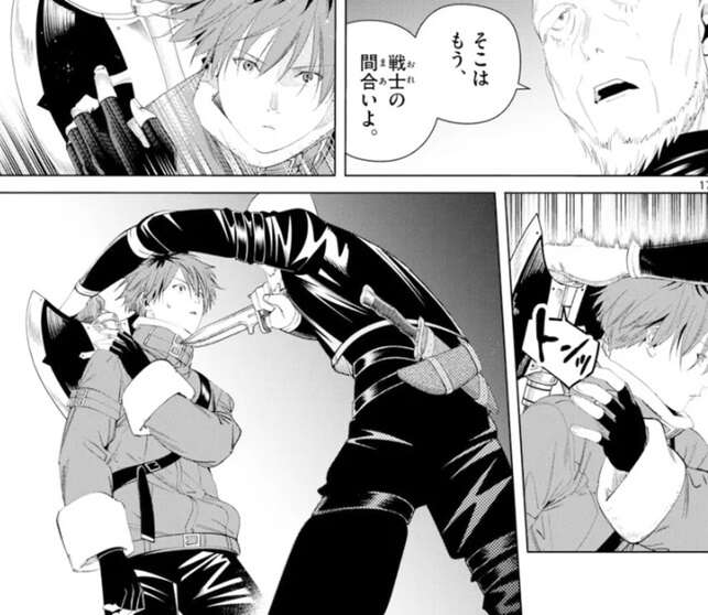 しかし、ラダールは話し合いには応じず、お前は老いぼれの俺よりも腕が立つだろうさ、場数も踏んでる、見りゃわかるよ、でも足りてねぇな、とナイフを構えながらシュタルクに言います。そこはもう、戦士(おれ)の間合いよ、とラダールが言うと、シュタルクも斧を取って構えようとしますが、シュタルクが斧を取るよりも速くラダールは斧を手で押さえ、ナイフをシュタルクの首に向けます。