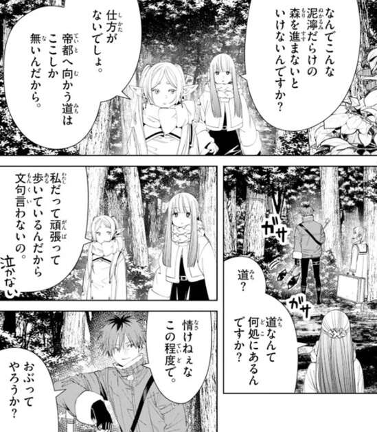 場面はフリーレン一行へと移り、フリーレン一行は泥濘(ぬかるみ)だらけの森を進んでいます。かなり険しい道で、フェルンが弱音を吐いていますが、帝都へ向かう道はここしか無いとフリーレンが言い、仕方なく歩いています。フリーレンは、私だって頑張って歩いているんだから文句言わないの、泣かない、と言ってフェルンを励ますと、シュタルクが、情けねぇな、この程度で、おぶってやろうか?と、冗談でフェルンに言います。