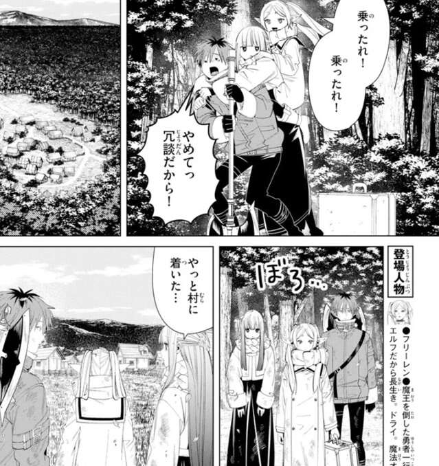 すると、フリーレンとフェルンは強引にシュタルクにおんぶしてもらい、冗談だからとシュタルクがやめるように二人に泣きながらお願いしています。そんなやり取りをしつつ、ボロボロになりながらやっと村にたどり着きます。峠道はまだ中継地点で悪路は続くようなので、フリーレンが宿を取って英気を養わないと、と言い宿を探しに行きます。