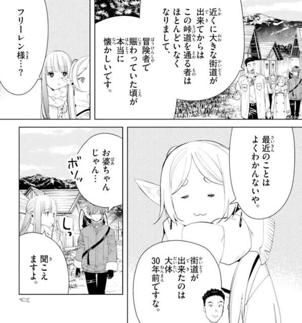 しかし、村の人に話を聞くと、近くに大きな街道が出来ていて、この峠道を通る人はほとんどいなくなったそうです。フェルンに、フリーレン様…?と聞かれて、最近のことはよくわかんないや、とフリーレンはとぼけますが、街道が出来たのは大体30年前だそうです。お婆ちゃんじゃん、とシュタルクがボソッと言うと、聞こえますよ、とフェルンがシュタルクに注意します。フリーレンをお婆ちゃん扱いすると、後々まで恨まれそうですが、シュタルクは大丈夫でしょうか?