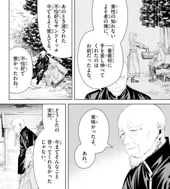 シュタルクの話は終わったようで、ラダールの奥さんと思われる女性がラダールに、冒険者さん達の話が面白かったと話しています。女性から聞けばよかったのにと言われますが村の連中は村長に伺いを立てるのが大好きだから、無駄な仕事で忙しかった、とラダールは答えます。女性は、慕われてるのよ、とラダールに言うと、ラダールは急に昔の事を話し始めます。素性の知れないよそ者の俺に一番最初に手を差し伸べてくれたのはお前だったとラダールは言い、あのとき渡された不格好なサンドイッチ今でもよく覚えてる、とラダールが言うと、女性は、不格好で悪かったわね、と答えますが、美味かったよあれ、とラダールは嬉しそうに話します。その後、ラダールは一つやり残した仕事があると言うと女性と別れ、フリーレン達が泊っている空き家の方に向かいます。