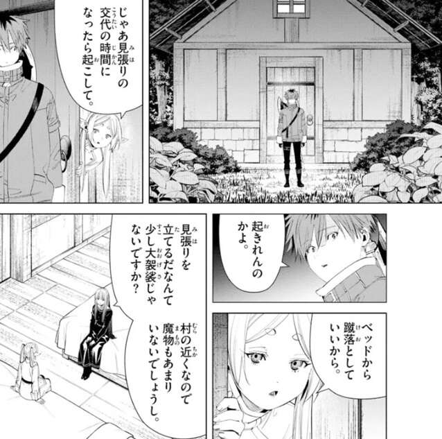 一方、空き家に泊っているフリーレン達ですが、シュタルクが見張りをしていました。フリーレンが、見張りの交代の時間になったら起こして、とシュタルクに言いますが、起きれんのかよ、とシュタルクが答えると、ベッドから蹴落としていいから、とフリーレンは言います。フェルンに見張りを立てて大袈裟じゃないですか?と、言われるますが、フリーレンは村の人達にラダールの事を聞いたと答えます。村長のラダールは穏やかで人当たりがいいこと以外は普通の人、と村人達は言っていたようですが、フリーレンは隠している理由が分からないと言います。そして、村長の手が現役の戦士の手だったと、とフリーレンはフェルンに明かします。どうやらラダールは現役の戦士のようですが、奥さんも含めて村人全員に自分が戦士であることを隠しているようです。