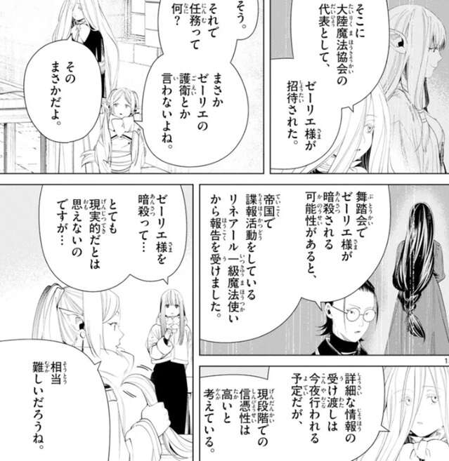 ゼンゼは任務の概要を話し始め、今帝都アイスベルクは建国際の期間中で、3日後の最終日に帝国領と北側諸国の要人が集まる、大規模な舞踏会が宮殿で執り行われるそうです。そこに大陸魔法協会の代表としてゼーリエが招待されていて、任務とはそのゼーリエの護衛だそうです。帝国で諜報活動をしているリネアール一級魔法使いから、舞踏会でゼーリエが暗殺される可能性があると報告があったそうです。詳細な情報の受け渡しは今夜行われる予定だそうですが、現段階で信憑性が高いとゼンゼは考えているようです。しかし、フリーレンもフェルンも、ゼーリエ暗殺なんてとても現実的でないと考えます。