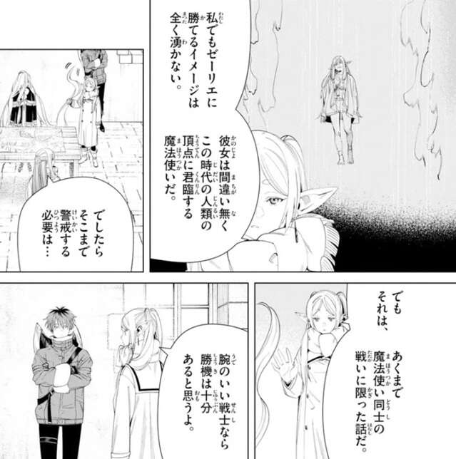 フリーレンでもゼーリエに勝てるイメージは全く湧かないそうで、ゼーリエは間違いなくこの時代の人類の頂点に君臨する魔法使いだと断言します。しかし、それはあくまで魔法使い同士の戦いに限った話で、腕のいい戦士なら勝機は十分にあると思うと、フリーレンは言います。