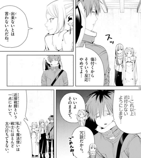 少し距離が離れていて、シュタルクのような戦士に不意打ちをされたらフリーレンとフェルンの二人でも何も出来ずに命を落とす、どうしても魔法の発動が間に合わない、とフリーレンは言います。そうフリーレンが言うと、フェルンはスゥとフリーレンの後ろに隠れてシュタルクを警戒しますが、シュタルクは、傷付くからそういう反応やめてよ…、と言います。しかし、出来ないとは言わないんだね、とフリーレンに言われて、これ以上近付かないようにします…、とシュタルクは涙目で謝ります。それを見てフリーレンは、いいよこのままで、と言ってくれて、フェルンも、冗談だからごめんね…、と謝ってくれます。