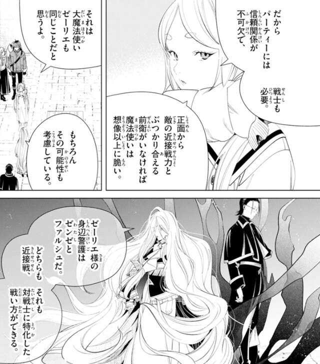 近接戦闘という1点においては、魔法使いは戦士にほとんど太刀打ちできないとフリーレンは言い、だからパーティには信頼関係が不可欠で、戦士も必要だと言います。正面から敵の近接戦力とぶつかり合える前衛がいないと、魔法使いは想像以上に脆く、それは大魔法使いゼーリエも同じだとフリーレンは言います。すると、ゼーリエ様の身辺警護はわたしとファルシュだ、どちらも近接戦、それも対戦士に特化した戦い方ができる、とゼンゼは言います。ゼンゼは髪を使った攻撃で戦士を圧倒できそうですし、ファルシュの魔法はどんなものか今の所不明ですが、ファルシュも近接戦に特化した魔法のようです。