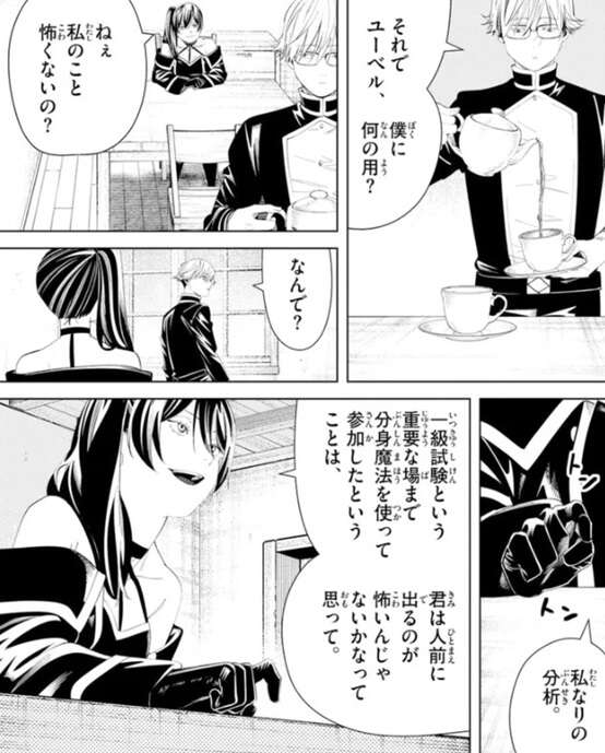 ラントはユーベルに何の用か聞きますが、ユーベルはラントに私の事が怖くないか逆に質問します。ラントは一級魔法使い試験で分身魔法を使って分身で参加していたので、ユーベルはラントが人前に出るのが怖いんじゃないかと思っているようです。さらにユーベルは、ラントが臆病者か、ただの悪趣味な人か、あるいはその両方か、と推測します。そして、安全な場所から、檻の中の危険な猛獣たちを見て回るのは楽しかった?と、ユーベルは聞いた後に、ここにはもうその檻は無いんだよ、とラントに脅しとも取れる発言をします。