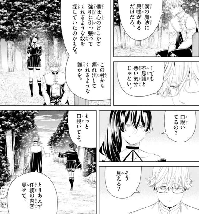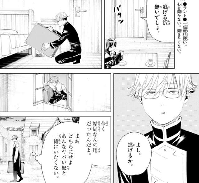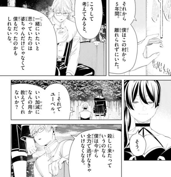 ただ、ラントの祖母は死期を悟った割には元気だったようで、ラントは面倒を見てるどころか見てもらっていて、結局祖母は孫のラントと一緒にいたかっただけなんだろう、とラントは考えます。そんなことを考えているうちに祖母はあっさり死んでしまいますが、それから5年間ラントはこの村を離れられずにいました。ラントは、一緒にいたいと思っていたのは、祖母でなく僕だったのかもしれない、とユーベルに祖母との事を教えます。その後、なんの用でここまで来たのか教えるようにユーベルに言います。ユーベルが殺しに来たっていうのなら僕は今から全力で逃げないといけなくなる、とラントはユーベルに言うと、やっと大陸魔法協会の任務で来たことをラントに告げます。