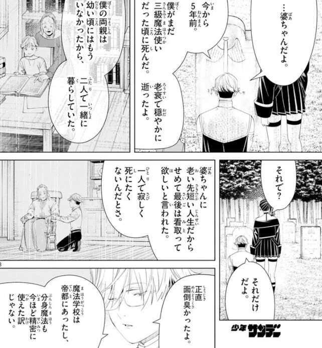 ユーベルはこのお墓は婆ちゃんのだよと言い、今から5年前にラントがまだ三級魔法使いだった頃に死んだ、老衰で穏やかに逝ったよ、と祖母の最後をユーベルに教えます。ラントが幼い頃にはもう両親がいなかったようで、ラントは祖母と一緒に暮らしていました。老い先短い人生だからせめて最後は看取って欲しいと祖母から言われて、ラントは一緒に暮らしていたそうですが、魔法学校は帝都にあり分身魔法も今ほど精密に使えたわけではなかったようで、正直面倒臭かったそうです。